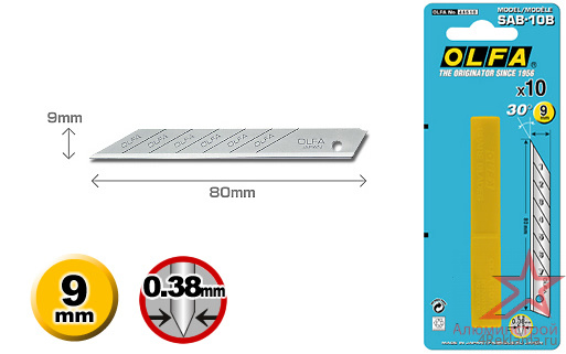 Высокоточное лезвие OLFA SAB-10B с углом 30, изготовленное из углеродистой стали повышенной твердости по запатентованной технологии OLFA с использованием многошагового процесса доводки, обеспечивающего высокое качество и остроту режущей кромки. Имеет двойной угол заточки и 7 режущих сегментов.