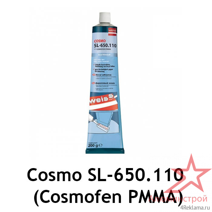 Прозрачный клей Cosmo SL-650.110 прекрасно подходит для быстрого конструкционного склеивания деталей из акрила и отличается, прежде всего, хорошей устойчивостью к тепловым нагрузкам и УФ-излучению, , что очень важно при склеивании материалов в рекламные конструкции предназначенных для наружного использования. Применяется при склеивания акриловых поверхностей при производстве витрин, рекламных стендов, объемных букв наружной рекламы.