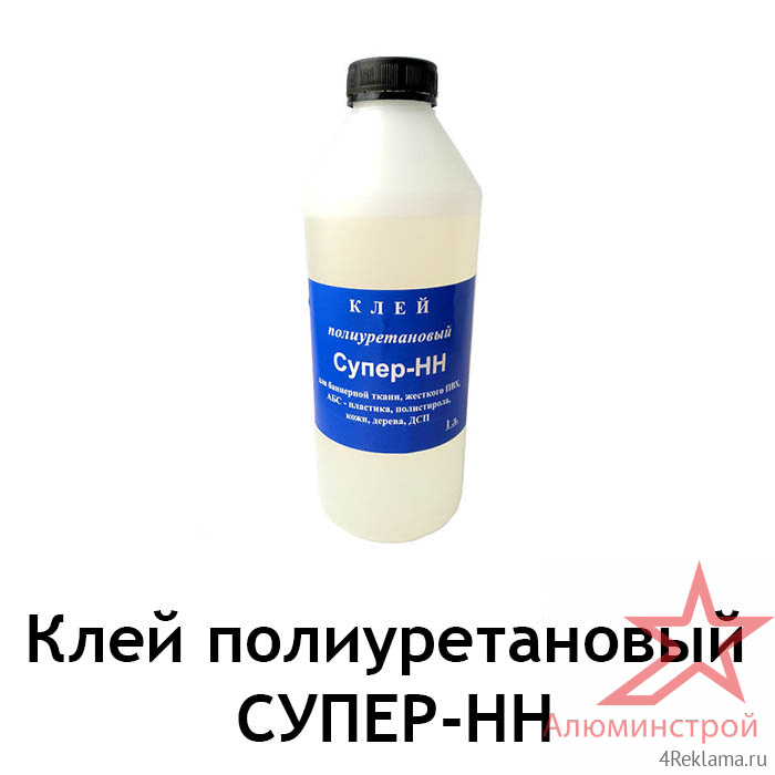 Представляет собой жидкий бесцветный однокомпонентный раствор, созданный на основе полиуретановых смол. Клей Супер-НН хорошо подходит для склеивания баннерной ткани, изделий из жесткого ПВХ, АБС-пластика, полистирола, кожи и дерева. Сохраняет липкий клеевой слой в течение 5-15 мин., что дает возможность поправлять склеиваемые поверхности в процессе работы.